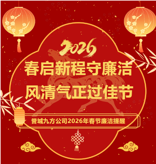 春启新程,福伴佳节;清风护航,廉守初心。值此2026年春节来临之际,誉城九方公司党委、纪委向大家致以最诚挚的节日祝福!同时,为深入贯彻落实中共中央纪委印发的《关于做好2026年元旦春节期间正风肃纪工作的通知》要求,切实筑牢廉洁防线,推动清廉之风浸润新春、廉洁之念根植于心,特向全体党员干部及职工严明节日廉洁纪律、重申作风建设要求,提醒大家在团圆欢庆之时,坚守廉洁底线、不越纪律红线,共度风清气正、温暖祥和的新春佳节!